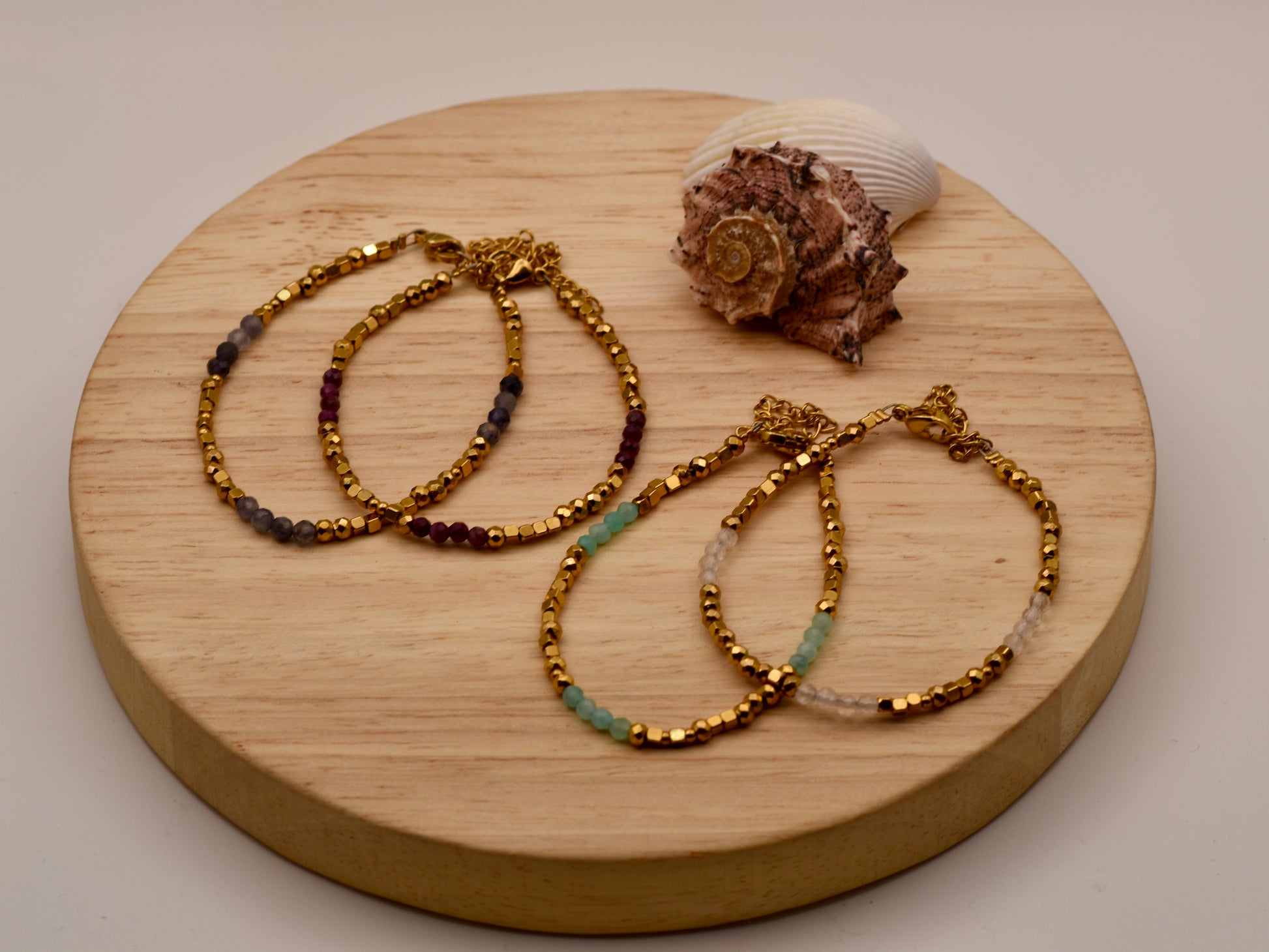 The perfect bracelet to add shine and glam while still keeping a soft, dainty look. Available in gold or silver, each piece features touches of a natural ruby stone for a subtle pop of berry-toned colour.