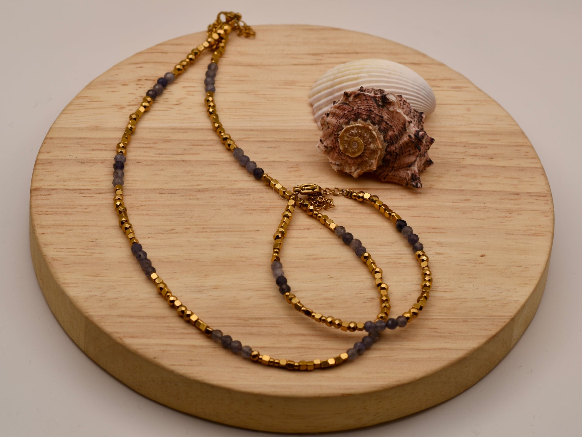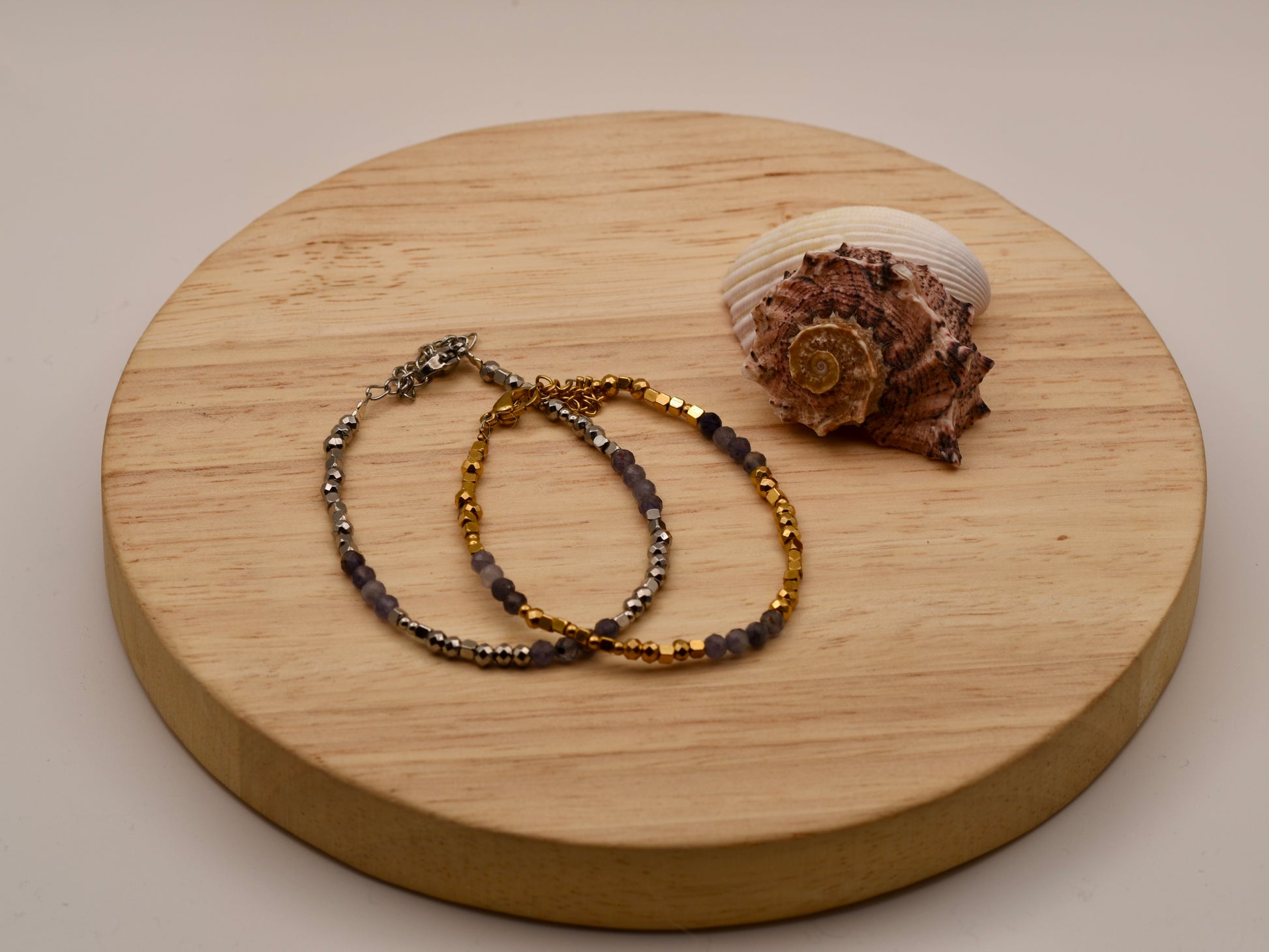 The perfect bracelet to add shine and glam while still keeping a soft, dainty look. Available in gold or silver, each piece features touches of a natural lolite stone for a subtle pop of lavender-toned colour.