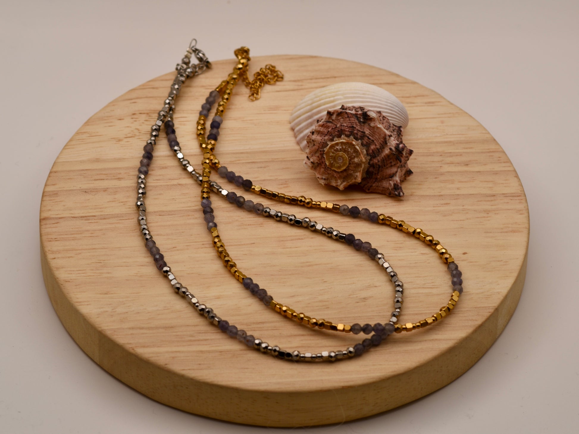 The perfect necklace to add shine and glam while still keeping a soft, dainty look. Available in gold or silver, each piece features touches of a natural lolite stone for a subtle pop of lavender-toned colour.